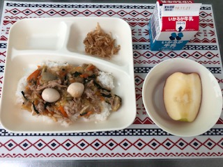 15日の給食は、中華丼・もやしの中華和え・りんご・ごはん・牛乳です。