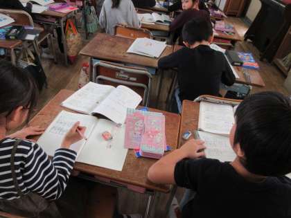 先生が黒板に書いた内容を、ノートに写しています。