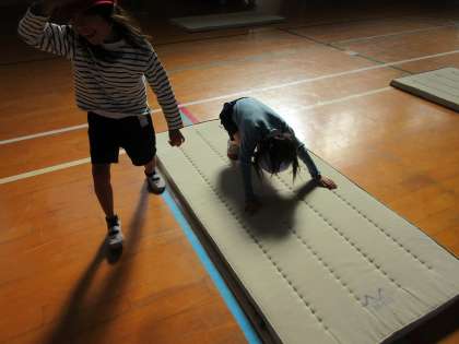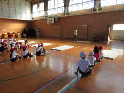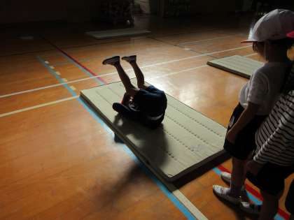 講堂で、マットを使って、後ろ回りの練習をしました。