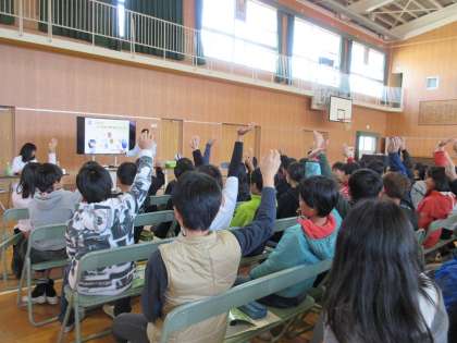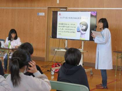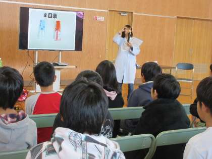 6年生は、6時限目に講堂で 薬剤師の松前さんから『薬の正しい使い方』の授業を受けました。薬の使い方や、気をつけることなど、大切な話を分かりやすく教えていただきました。