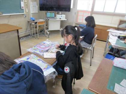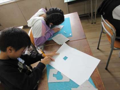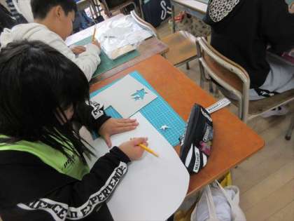 4年1組は、3時限目 図画工作の授業です。ランプのデザインをカッターを使って、切り取っています。カッターの使い方を注意しながら、慎重に切っていますね。