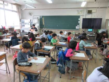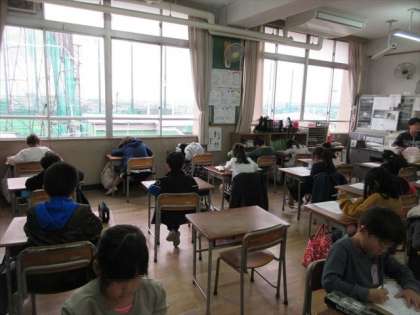 2年2組は、5時限目 算数の授業です。今日は、テストをしています。問題用紙にむかって、真剣に取り組んでいます。