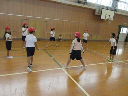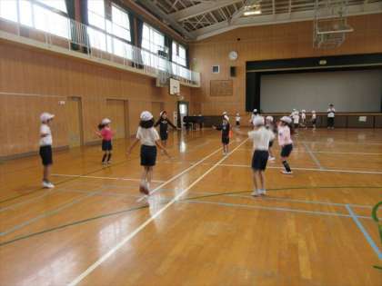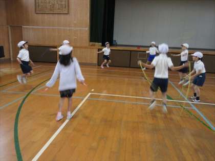 2年2組は、2時限目体育の授業です。講堂で、4つのチームに分かれて、縄跳びじゃんけんをしました。子どもたちは、元気よく声を出してじゃんけんしました。