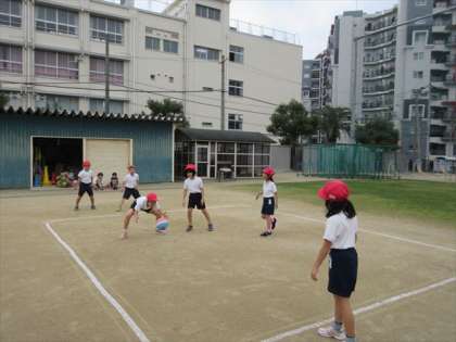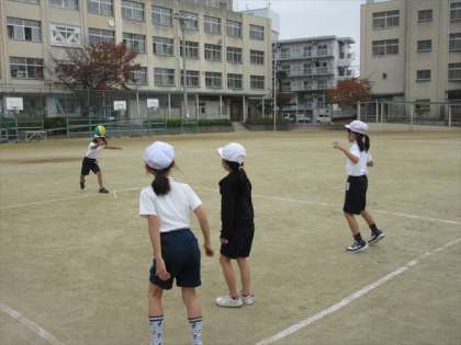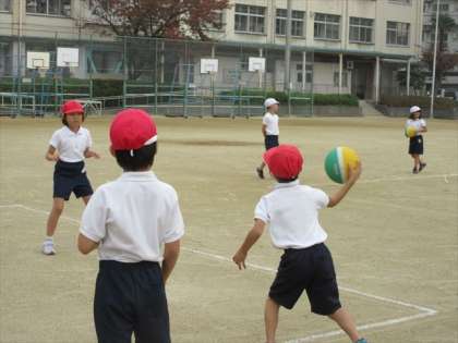 2年1組は、2時限目体育の授業です。運動場で、4つのチームに分かれて、ボールを投げて「中あて」をしました。ねらったところに、うまく投げられたかな。