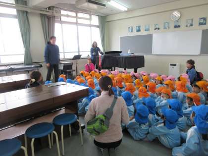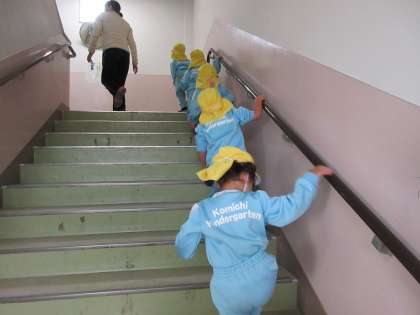 近隣の幼稚園(こみち幼稚園)が、避難訓練を本校に来ました。幼稚園の子どもたちは、階段をしっかり上って本校4階の図書室や音楽室に入りました。校長先生のお話もしっかり聞いていました。帰りも、先生の話を聞いて動けました。