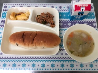 5日の給食は、豚肉のケチャップソテー・コーンスープ・焼きプリン・おさつパン・牛乳です。