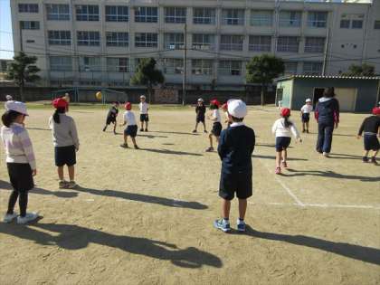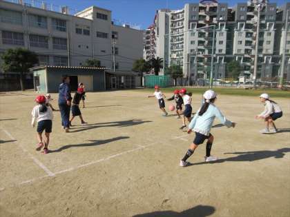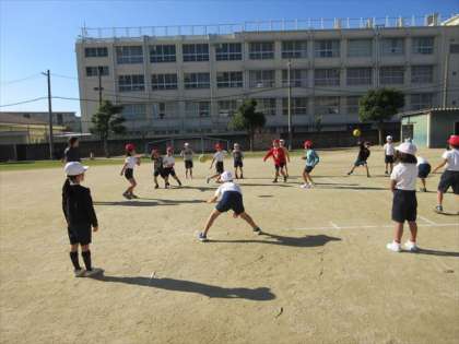 12月9日(月) 2年1組は、2時限目体育の授業です。3つのチームに分かれて、中あてのゲームをしています。狙いをつけて、ボールを投げていますね。