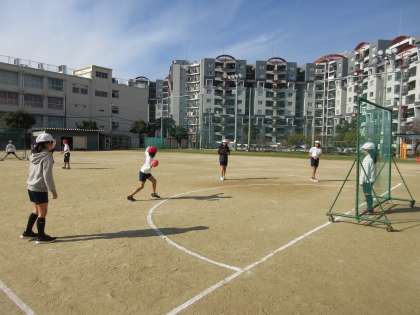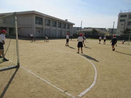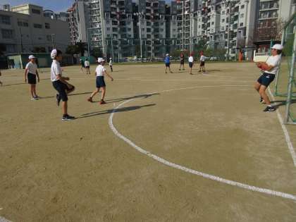 運動場で、各チームに分かれて、ハンドボールの練習をしています。