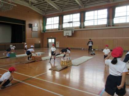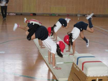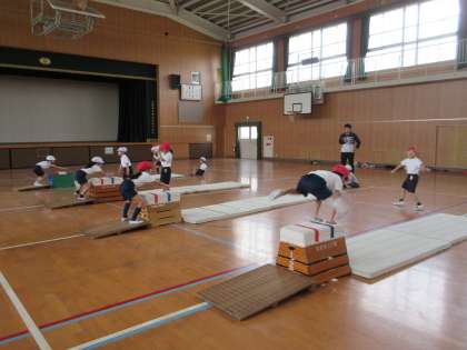 準備ができた後は、マットで床をける練習をします。そして、いよいよ台を跳びます。