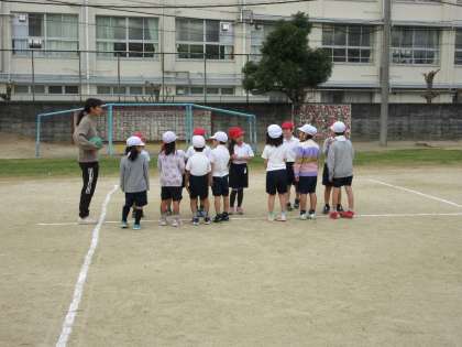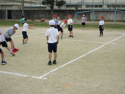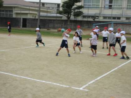 向かい合って礼をして、ドッジボールが始まります。ボールを投げる、受ける、ボールから逃げるなど、活発に動きました。