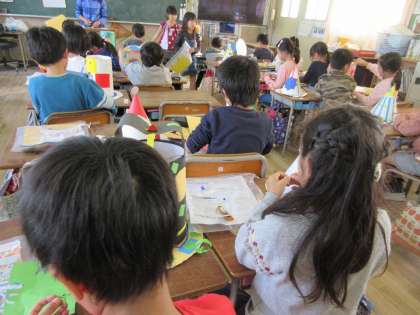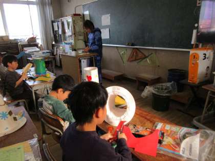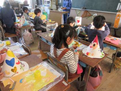 カラフルなハットを作っています。色紙を切ったり、飾りをつけたりして工夫をしています。