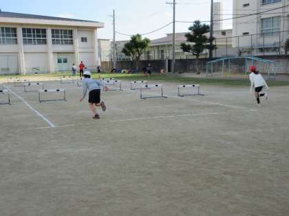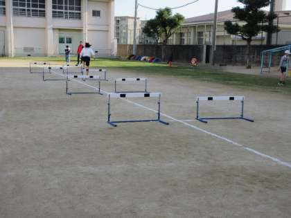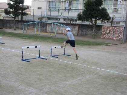 「ハードル走」のタイムを計っていました。繰り返し練習したので、スムーズにハードルを越えるようになりました。