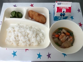 16日の給食は、たらのフライ・豚肉とあつあげの煮もの・あっさりきゅうり・ごはん・牛乳です。