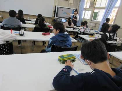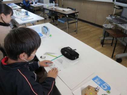 1階多目的室のクラスも、「台形の面積」の求め方を考えています。図のプリントをノートに貼り、理解を深めています。