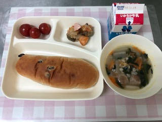 19日の給食は、さけのマリネ・肉団子と麦のスープ・プチトマト・レーズンパン・牛乳です。