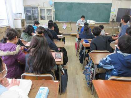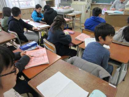 冬休みの課題を机に出して、友だちとお互いに確認していますね。
