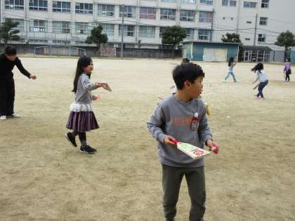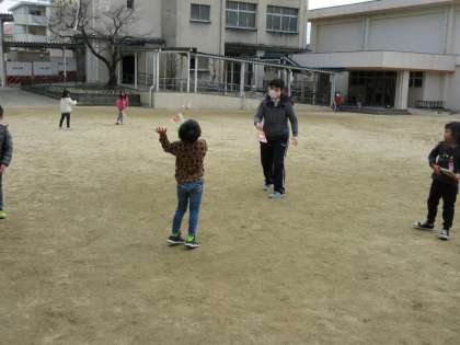 1年生は、4時限目に、昔からの遊びである「羽子板」を使いました。