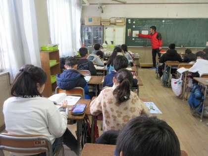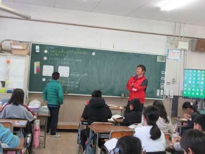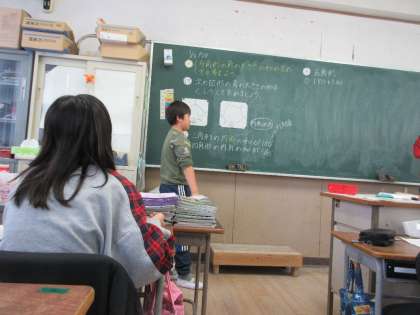 多角形の内角の和が何度なのか、考えています。補助線を引いて、発表しています。