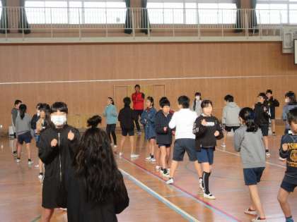 講堂で、実技指導を受けました。まずは、あいさつから始まり、基本動作から体験しました。