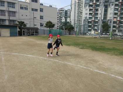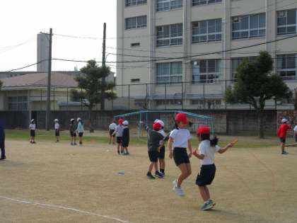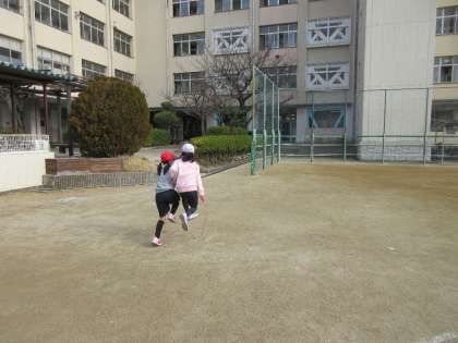 2組がシャトルランの練習の横で、なわとびの練習をしています。ペアになって、いろんなとび方をやっています。