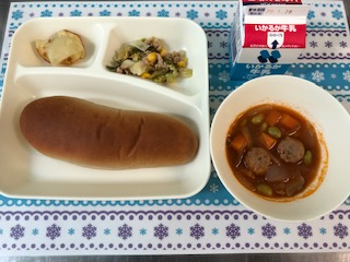 22日の献立は、ミートボールのケチャップ煮・ツナと野菜のソテー・焼きじゃが・黒糖パン・牛乳です。