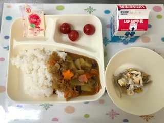 27日の給食は、豚肉と金時豆のカレーライス・ごぼうサラダ・プチトマト・ごはん・牛乳です。