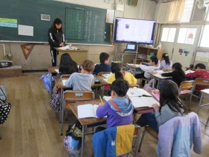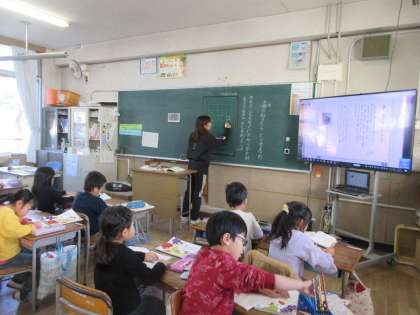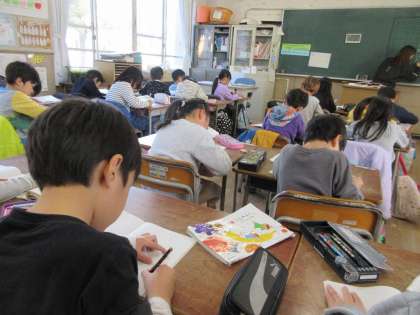 全員で声を出して、教科書の本文を読みました。そして、黒板に書いたことをノートに丁寧に書いています。