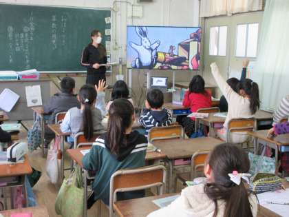 大画面に英語の絵本が映され、ラビットの絵をしっかり見ています。