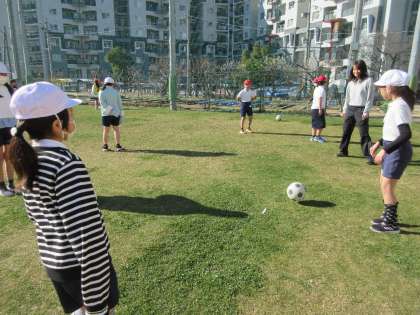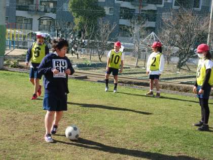 運動場で、チームに分かれてミニサッカーをしました。パスをつないで、シュート。