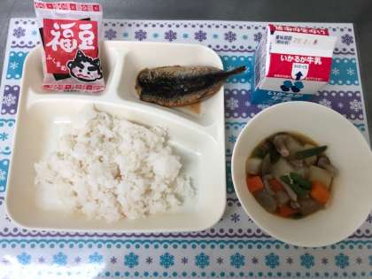 3日の給食は、いわしのしょうがじょうゆかけ・含め煮・いり大豆・ごはん・牛乳です。