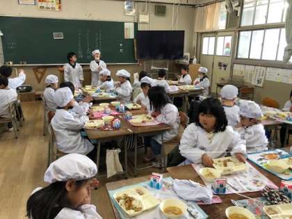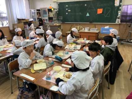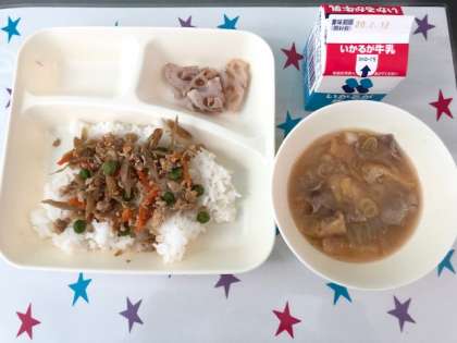 6日の給食は、とりごぼうごはん・みそ汁・焼きれんこん・牛乳です。