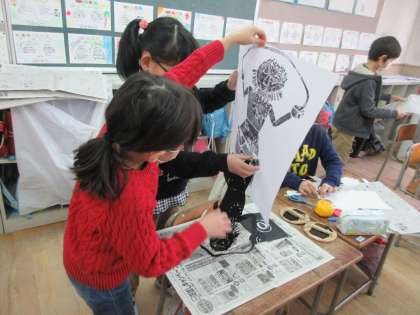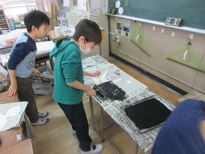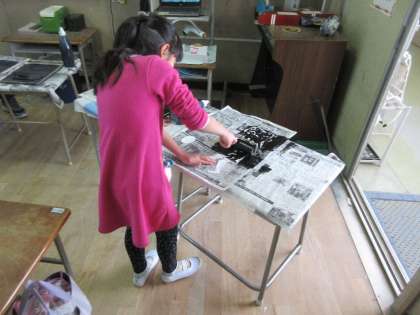 「楽しくうつして」で、形作った台紙にインクをつけて、白い紙にうつしています。