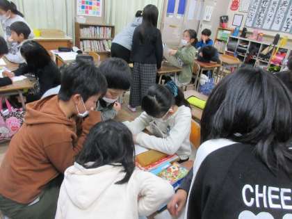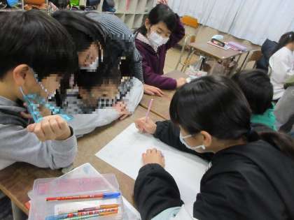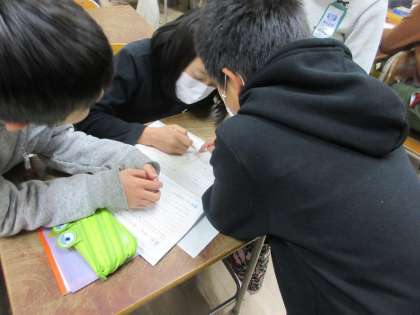 『報告します』で、班に分かれて、調べたことを相談して、まとめています。