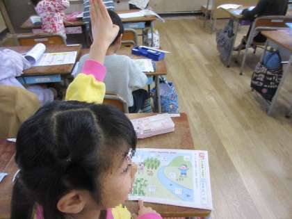 漢字ドリルの課題ができた人は、元気に手を挙げて、先生に見てもらっています。