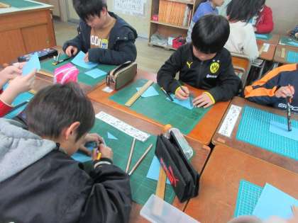 マットを敷いて、カッターナイフで形に添って紙を切る練習をしました。