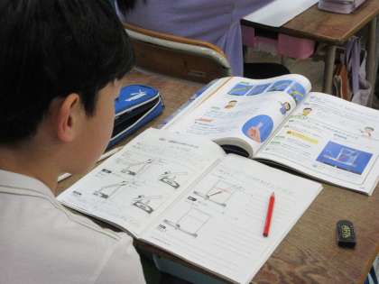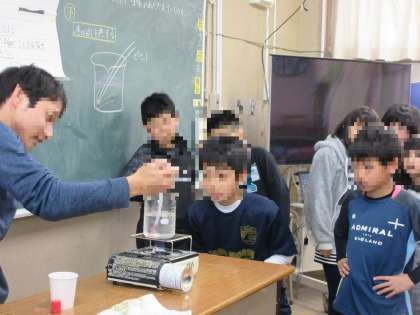 赤い色であたたかい水がどのように動くかを考え、実験で調べました。