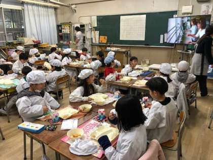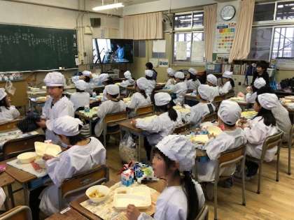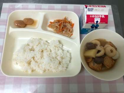 14日の給食は、かんとう煮・もやしとにんじんの甘酢和え・白花豆の煮もの・ごはん・牛乳です。