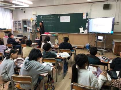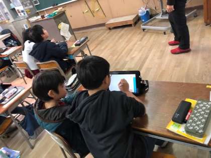 3年1組の教室では、わくわくコースが2人1組になって、タブレットを使って学習していました。