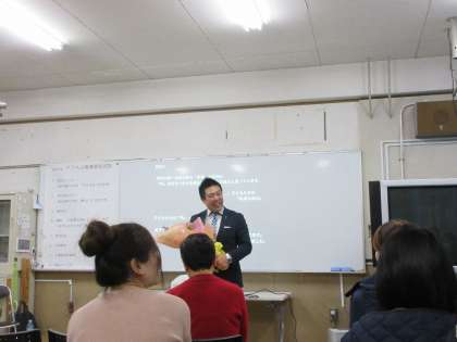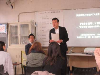土曜授業の後、本校の1F多目的室で午後2時30分よりPTA主催 人権講演会が行われました。講師には、井高野中学校の谷川先生に来ていただき、PBS『積極的で肯定的な行動支援』により変化した中学校の様子をお話していただきました。