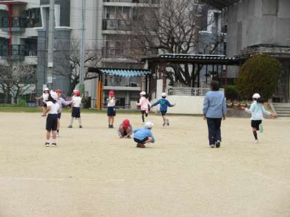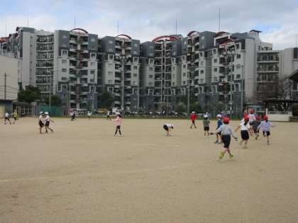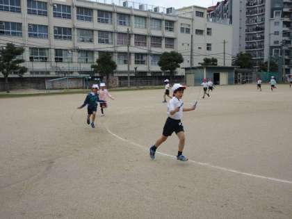 なわとびの練習で、トラックの周りを勢いよく走りながら、なわとびを飛びました。