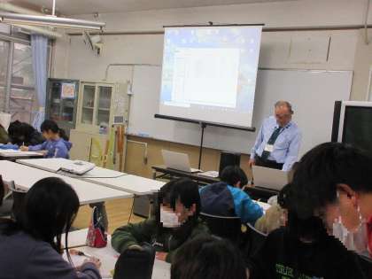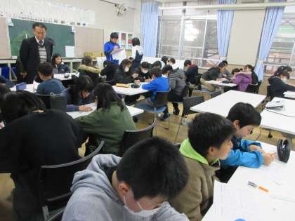 5年2組は5・6時限目に、プログラミング特別授業として、大阪教育大学の上出先生に来ていただいて算数の授業をしていただきました。たくさんの先生も参観する中、子どもたちは座標の上に図を書き『スクラッチ』を使って、表すことができるのを体験してもらいました。
