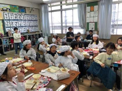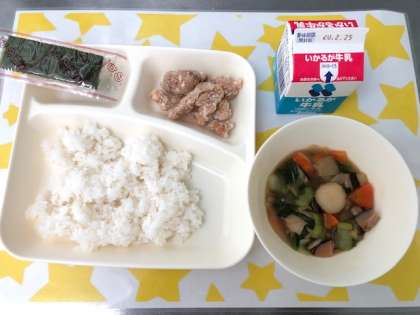19日の給食は、けいにくのから揚げ・まる天とやさいのうま煮・焼きのり・ごはん・牛乳です。
