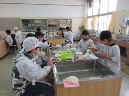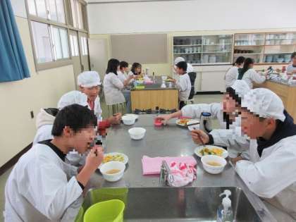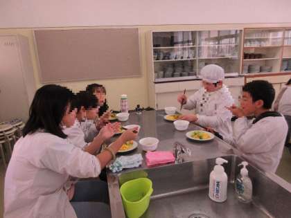 6年1組は、調理して、料理が出来上がりました。作った料理を喜んで食べました。