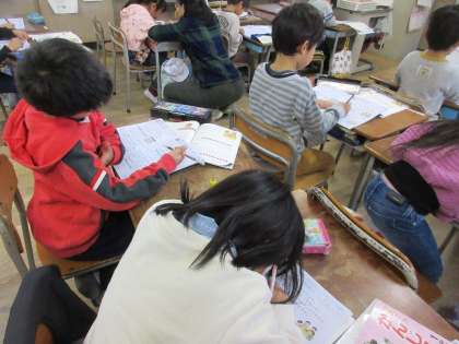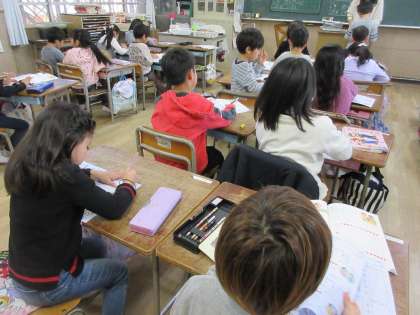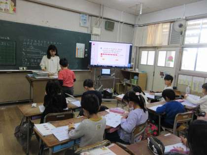 「みかんはなんこ?」の問題を考え、その後、練習問題をしています。できた人は、先生に見てもらっています。