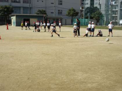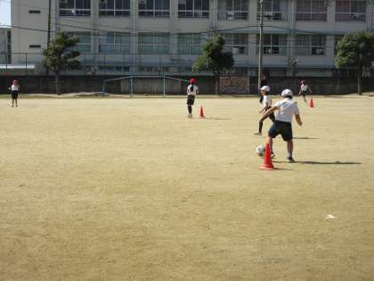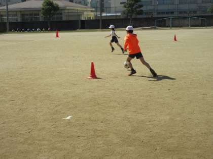 サッカーボールでドリブルしながら赤いコーンを回って走っています。