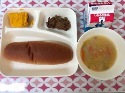 25日の給食は、牛肉のデミグラスソース煮・コーンスープ・かぼちゃのプリン・黒糖パン・牛乳です。