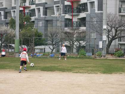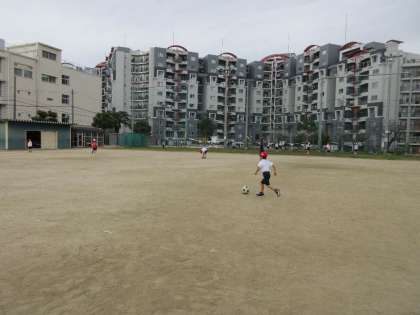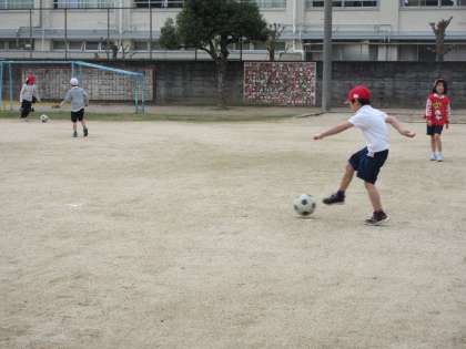運動場に出て、なわとびの練習の後、サッカーボールを使って、ボールをける練習をしました。