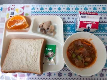 28日の給食は、けい肉のガーリック風味焼き・ぶた肉と野菜のケチャップ煮・デコポン・食パン・ソフトマーガリン・牛乳です。