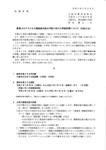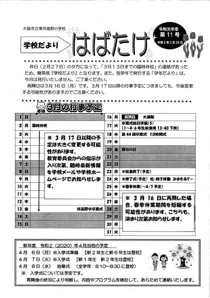 各自治体により学校休業や対応が異なりますが、大阪市教育委員会からの指導により、学校休業は、2月29日(土)〜3月13日(金)(14日間)となっております。ご確認をよろしくお願いいたします。これにより、3月の行事や予定も変更になっておりますので、学校だより3月号をご覧ください。