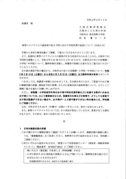 新型コロナウイルス感染症の拡大予防に向けた学校休業の延長について(お知らせ)3月11日